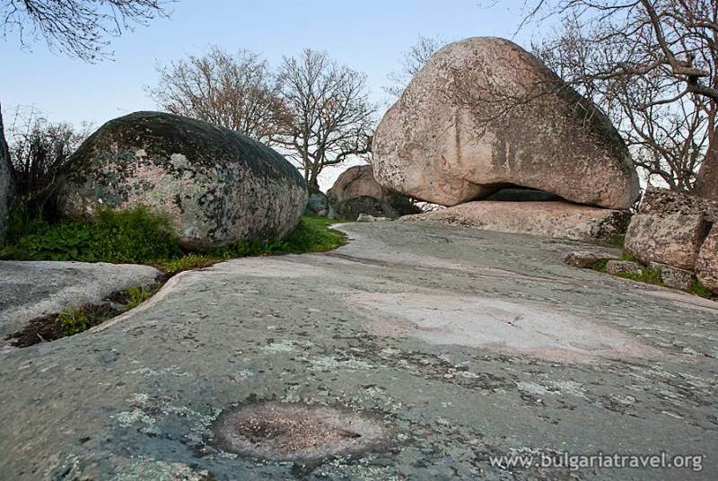 The entrance for the sanctuary is from the southwest. A stone “marriage bed” can be reached by a cliff path. Two sacrificial stones surround the bed. Deep baths are dug into them, connected by outfalls for pouring of ritual liquids – wine, milk, olive oil, rain water. A throne of stone stands next to them; deep outfalls and crossing lines are dug around it, which join and form a large rectangular “sharapana”. Three “menhiris” (large round stones) lie in the eastern part of the circle. At the top of the highest “menhiri” is carved a “divine step”, 0.6 meters long, 0.34 meters wide. The same “divine step” can be found in the opposite southern section at the foot of the rock terrace. The divine steps mark the innermost sacred place, only determined for the ones, who are initiated to participate in the mysteries.