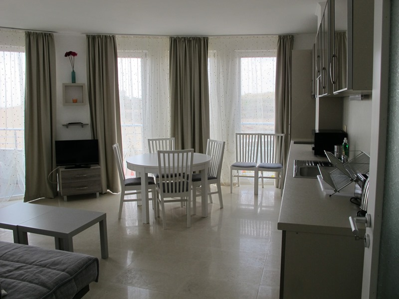Апарткомплекс Кристал Бийч се състои от 2 секции с апартаменти с 1 или 2 спални, както и студия, общо 64 на брой, много от които имат панорамна гледка към морето и плажа.