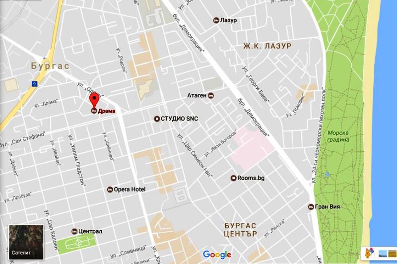 Хотел Драма се намира на тихо, спокойно и комуникативно място в централната част на гр. Бургас, на улица Драма номер 12.