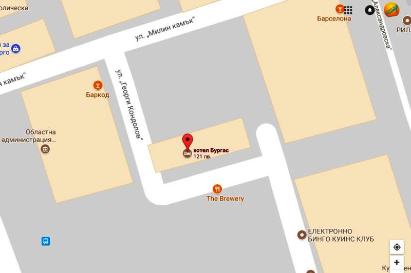 Хотел Бургас се намира в центъра на града, ул. Хан Крум 5, на 50 метра от централната жп гара. Разполага с паркинг.