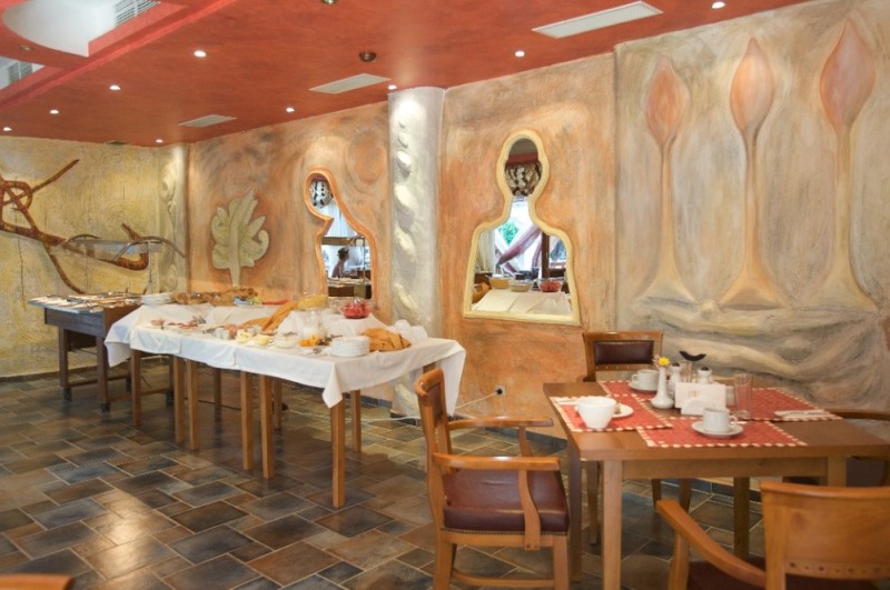 Гостите могат да се отпуснат на сянка във външния бар, както и да се хранят в ресторанта на място. Настаняването на база полу-пансион включва вечеря с бутилка минерална вода или бутилка бира, или безалкохолна напитка и чаша червено или бяло вино. Осигурен е и безплатен Wi-Fi в лобито и в стаите.