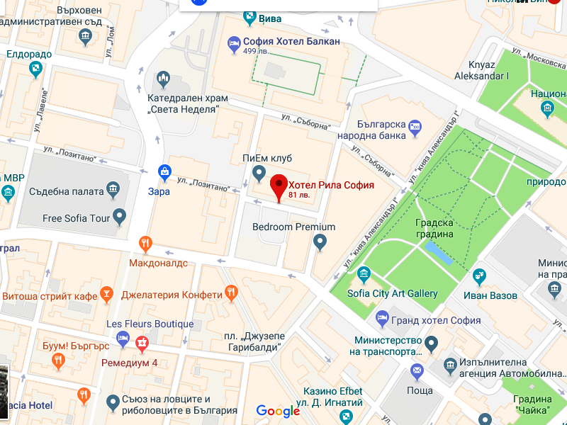 Рила хотел се намира на централно място в София, само на 50 м от главния търговски булевард Витоша. Предлага бар, ресторант, конферентни съоръжения и безплатен Wi-Fi достъп до интернет.