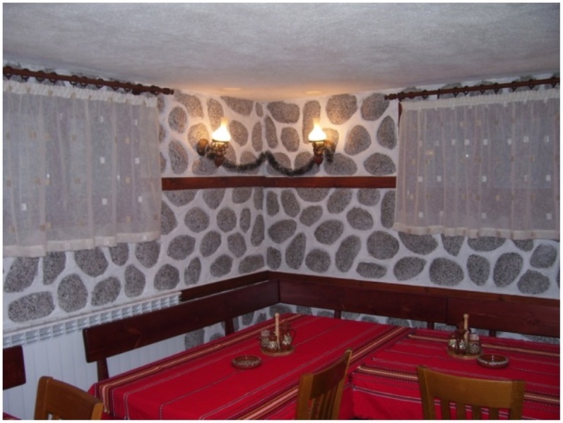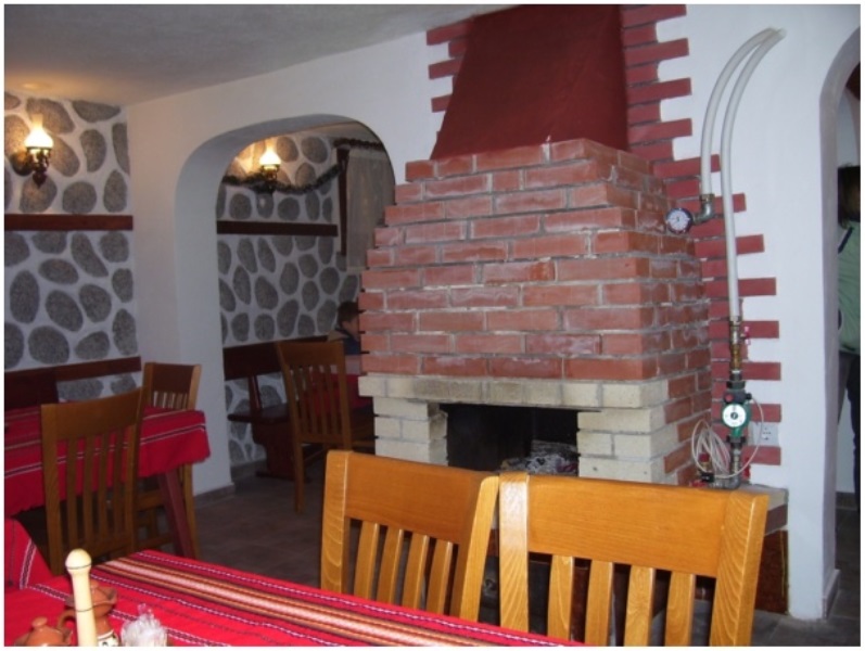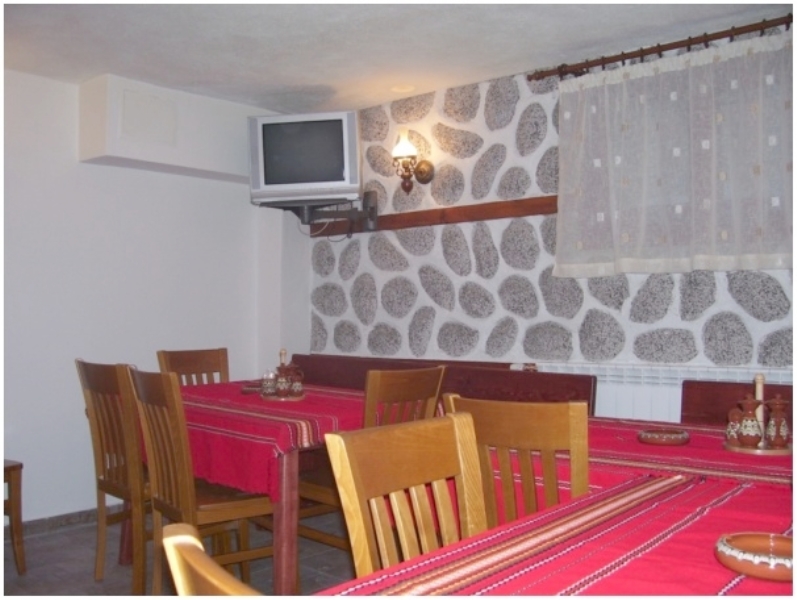 Уютният ресторант с открита камина сервира българска и международна кухня.